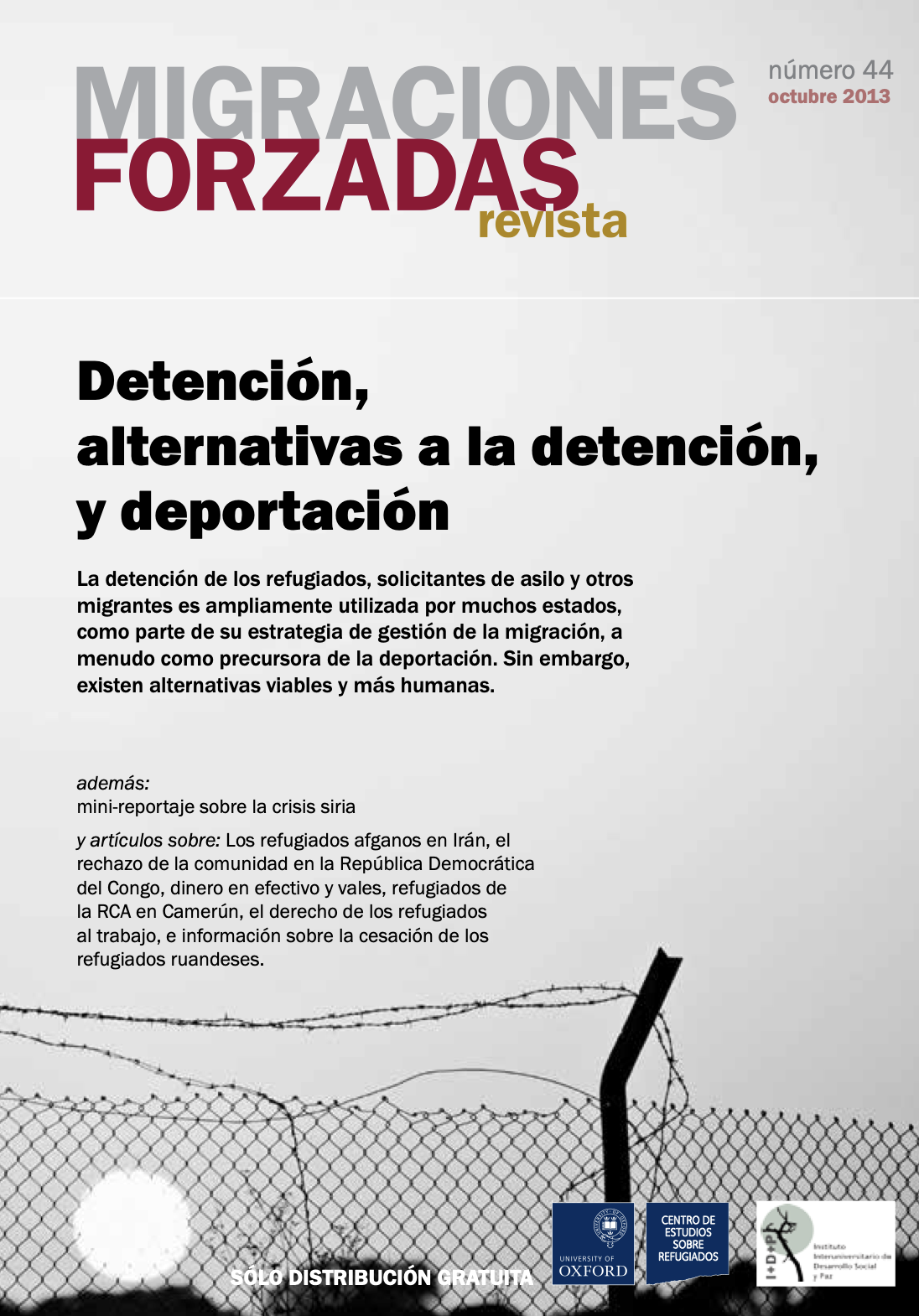 Cada vez más solicitantes de asilo y refugiados (hombres, mujeres e incluso niños) son detenidos e internados en todo el mundo, al igual que muchos otros migrantes. Algunas veces detenidos de forma indefinida y a menudo en terribles condiciones, pueden sufrir no sólo la privación de libertad sino también otros abusos que van en detrimento de sus derechos humanos. La detención puede parece ser una solución conveniente para la cruzada política que los Estados emprenden para gestionar la migración pero es una opción muy cara y deja secuelas duraderas en las personas. En su búsqueda de un enfoque más humano –y más económico–, las agencias y las autoridades gubernamentales han puesto a prueba diversas alternativas a la detención. RMF 44 incluye 36 artículos sobre la detención de inmigrantes, las alternativas a la detención y deportación, además de un pequeño apartado sobre la crisis siria.