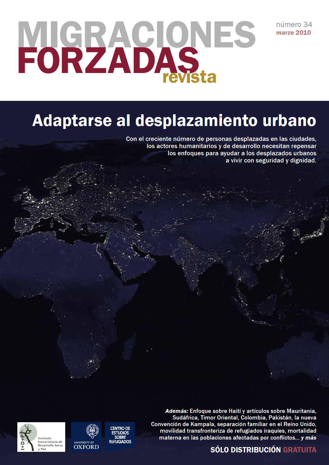 En los artículos introductorios de esta edición de RMF, António Guterres, el Alto Comisionado para los Refugiados, y Anna Tibaijuka, Directora Ejecutiva de ONU-Habitat, ponen de relieve la complejidad de los desafíos a los que se enfrentan los desplazados en las zonas urbanas y aquéllos que tratan de protegerles y asistirles, y sostienen la necesidad de un replanteamiento radical de los enfoques de la comunidad internacional. En este número de la Revista Migraciones Forzadas se incluye 26 artículos de una amplia gama de autores – profesionales, políticos e investigadores – sobre el tema de los desplazamientos urbanos, además de 13 artículos sobre otros aspectos de la migración forzada y un “enfoque” sobre Haití después del terremoto.