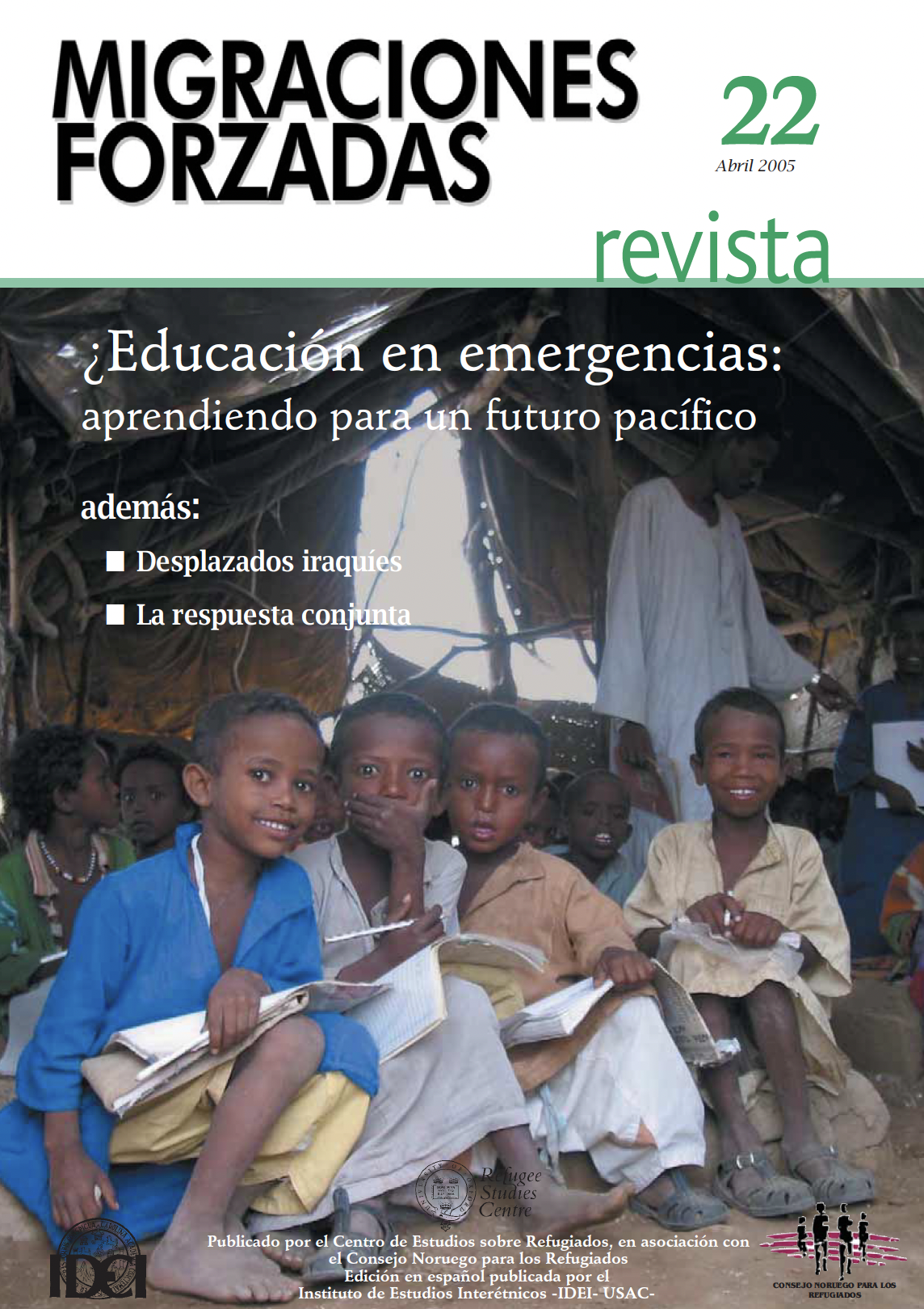 El número sin precedentes de personas que han querido escribir para la sección principal de este RMF refleja el creciente interés en la educación post-conflicto. RMF 22 se publica en un punto de inflexión en este sector emergente – tras el lanzamiento de las Normas Mínimas para la Educación en Situaciones de Emergencia. en la segundo, Consulta Mundial Interinstitucional sobre la Educación en Situaciones de Emergencia y Reconstrucción Temprana, celebrada en Ciudad del Cabo (diciembre de 2004).