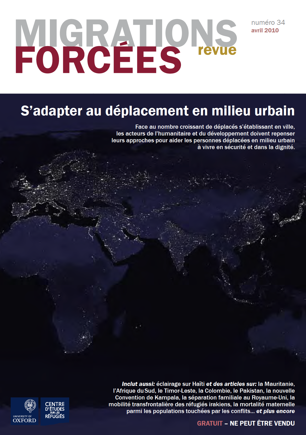 Dans leurs articles d’introduction à ce numéro de RMF, António Guterres, le Haut-Commissaire de l’ONU pour les réfugiés, et Anna Tibaijuka, Directrice exécutive d’UN-HABITAT, soulignent la complexité des défis qui attendent les personnes déplacées en milieu urbain et ceux qui cherchent à les protéger et à les aider, et affirment que la communauté internationale a besoin de repenser radicalement ses approches. Ce numéro de la Revue des Migrations Forcées comprend 26 articles rédigés par une grande diversité d’auteurs – professionnels, décideurs et chercheurs – sur le sujet du déplacement en milieu urbain, ainsi que 13 articles sur d’autres aspects de la migration forcée, y compris un article spécial sur Haïti après le séisme.