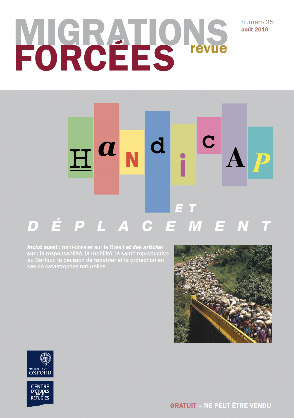 Les 27 articles illustrant le thème principal de ce numéro de RMF expliquent pourquoi les personnes handicapées déplacées devraient faire l’objet d’une attention particulière et mettent en avant quelques initiatives qui ont été adoptées (au niveau local ou mondial) pour changer les mentalités et les pratiques, afin que leur vulnérabilité soit reconnue, que leurs voix se fassent entendre – et que les réponses deviennent inclusives.