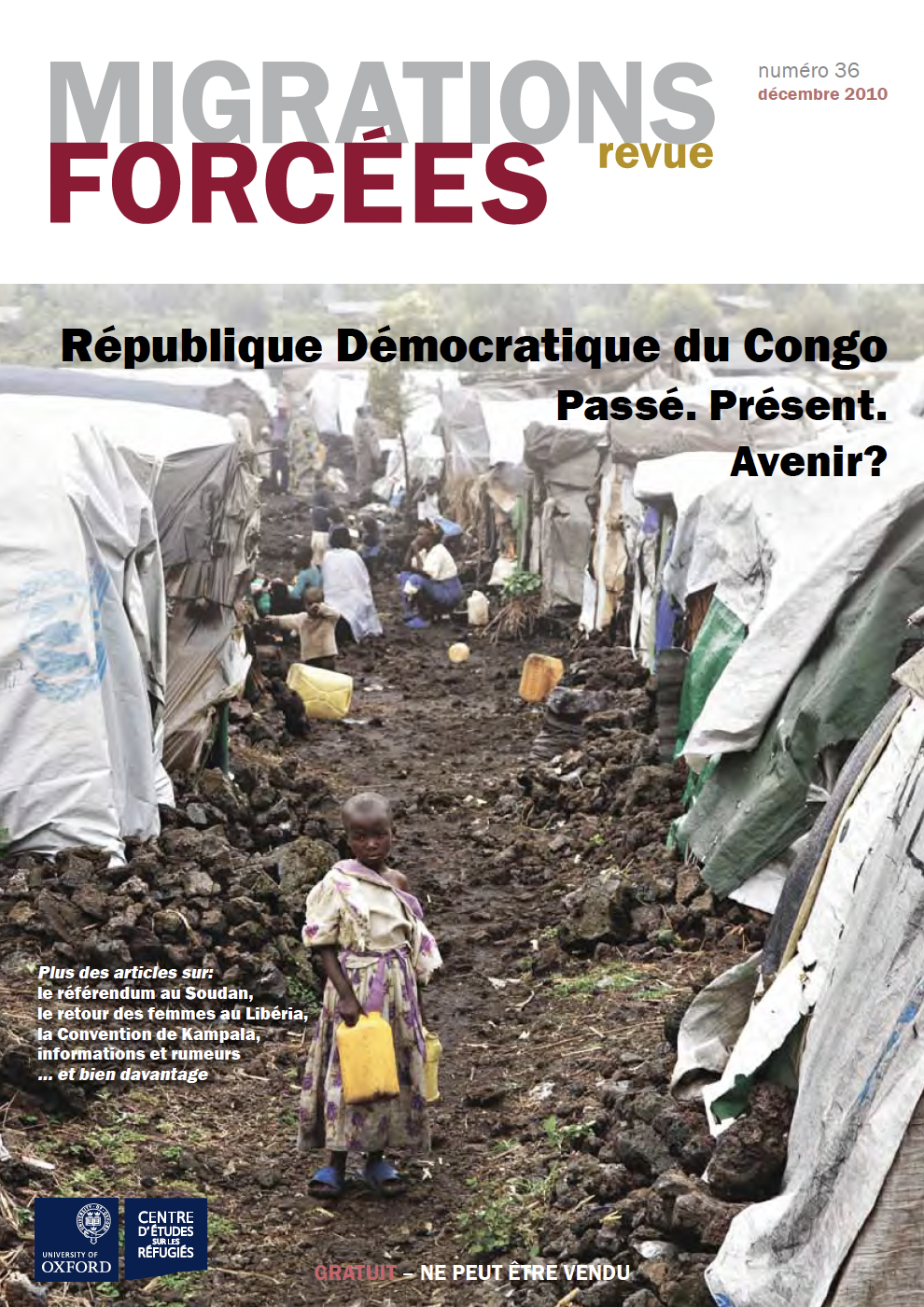 Les 30 articles du thème principal du dernier numéro – rédigés par une grande diversité d’auteurs – abordent les causes du déplacement congolais, les programmes et approches actuels et les perspectives futures. Alors que le panorama dressé par les articles contenus dans ce numéro de RMF constitue une lecture sombre, ceux-ci contiennent tout de même, du moins potentiellement, des lueurs d’espoir pour un avenir meilleur à côté d’une analyse qui cherche à examiner comment et pourquoi de tels événements ont pu avoir lieu.